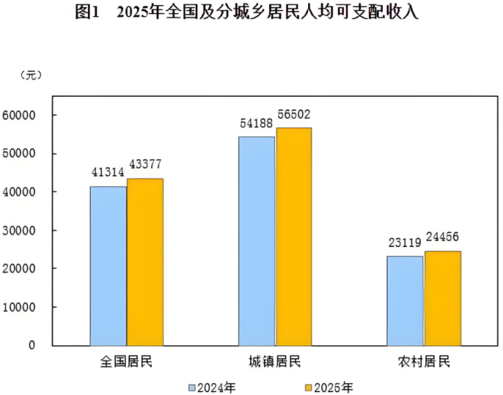 先看一组国家统计局公布的数据。2025年全国居民人均可支配收入为43,377元,中位数为36,231元(更真实代表普通居民的收入状况)。